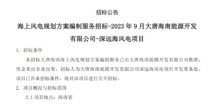 8月14日,大唐電子商務(wù)平臺(tái)發(fā)布《海上風(fēng)電規(guī)劃方案編制服務(wù)招標(biāo)-2023年9月大唐海南能源開發(fā)有限公司-深遠(yuǎn)海風(fēng)電項(xiàng)目招標(biāo)公告》。