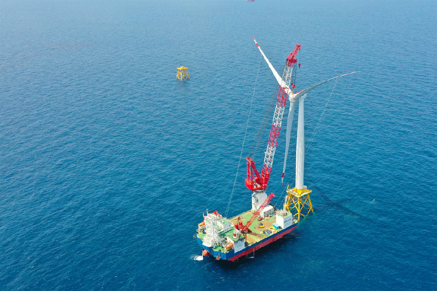 5月6日,由中國能建廣東院勘察設計、廣東火電參建的國內(nèi)首個近海深水區(qū)海上風電場——華電陽江青洲三500兆瓦海上風電場完成首臺風機吊裝。
