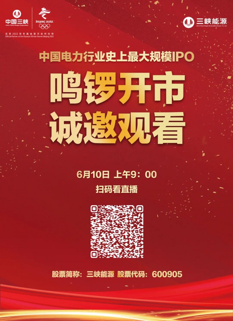 中國電力行業(yè)史上最大規(guī)模IPO,據(jù)中國三峽新能源(集團(tuán))股份有限公司發(fā)布《上市公告書》顯示,三峽能源股票將于今日9:00在上海證券交易所上市。股票代碼“600905”