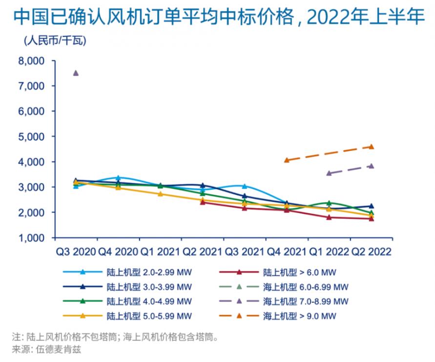 陸上風(fēng)機(jī)平均中標(biāo)價(jià)格在2022年第一季度再創(chuàng)新低。在首個(gè)7MW+陸上風(fēng)電機(jī)組的批量訂單中,出現(xiàn)了歷史最低中標(biāo)價(jià)格1408元/千瓦(不含塔筒)。雖然第二季度價(jià)格略有回升,但較2021年底水平仍下降了15%。新簽無(wú)補(bǔ)貼的海上項(xiàng)目與時(shí)間上最鄰近的有補(bǔ)貼的海上項(xiàng)目(2020年)相比,風(fēng)機(jī)平均中標(biāo)價(jià)格(含塔筒)下降了超過(guò)40%。大兆瓦機(jī)組的廣泛應(yīng)用,使中國(guó)風(fēng)電整機(jī)商能夠以較低的單位千瓦價(jià)格進(jìn)行投標(biāo)。例如,6MW陸上風(fēng)機(jī)的平均價(jià)格比3MW陸上風(fēng)機(jī)平均價(jià)格低22%。