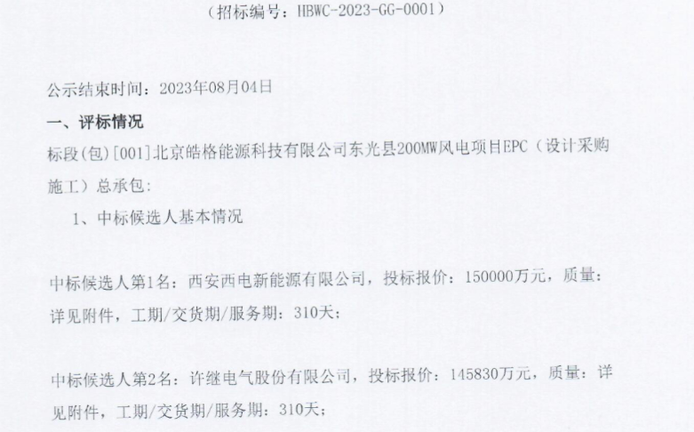公告顯示,第一中標(biāo)候選人:西安西電新能源有限公司,投標(biāo)報(bào)價(jià): 150000萬(wàn)元。第二中標(biāo)候選人:許繼電氣股份有限公司,投標(biāo)報(bào)價(jià): 145830萬(wàn)元。第三中標(biāo)候選人:中國(guó)能源建設(shè)集團(tuán)陜西省電力設(shè)計(jì)院有限公司,投標(biāo)報(bào)價(jià):155492萬(wàn)元。