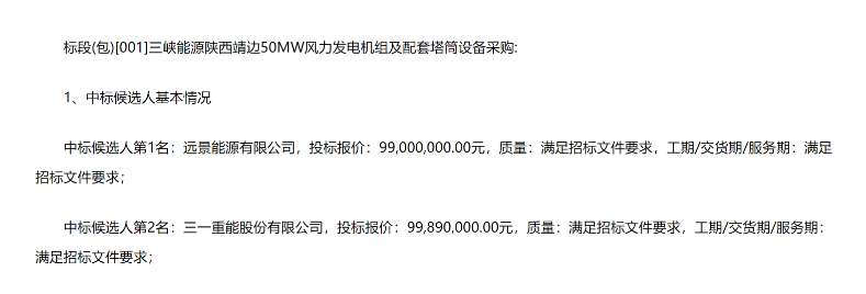 公告顯示,第一中標候選人:遠景能源有限公司,投標報價:99,000,000.00元。第二中標候選人:三一重能股份有限公司,投標報價:99,890,000.00元。第三中標候選人:明陽智慧能源集團股份公司,投標報價:104,000,000.00元。