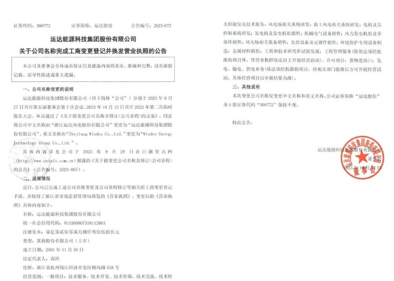 近日,經(jīng)運達股份股東大會審議通過,運達股份的公司全稱正式變更為“運達能源科技集團股份有限公司”,該公司已完成上述公司名稱變更及公司章程修訂等相關的工商變更登記手續(xù),并取得了浙江省市場監(jiān)督管理局頒發(fā)的《營業(yè)執(zhí)照》。