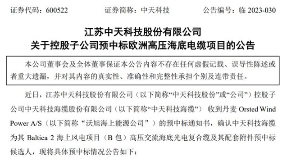 5月15日,江蘇中天科技股份有限公司(以下簡稱“中天科技”或“公司”)發(fā)布《關(guān)于控股子公司預(yù)中標歐洲高壓海底電纜項目的公告》。