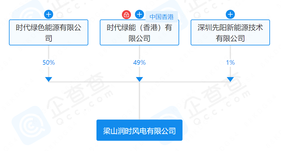 從企查查獲悉,近日,梁山潤時風(fēng)電有限公司成立,注冊資本1000萬元人民幣。新公司由深圳先陽新能源技術(shù)有限公司(1%)、時代綠能(香港)有限公司(49%)以及寧德時代旗下時代綠色能源有限公司(50%)共同持股。