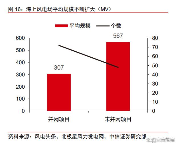 大型化和風電場規(guī)模化加速,推動風機降本。大型化是海風降低單位 GW 成本的主要 途徑,大型風機單位功率對應的耗材更少,同時由于大型化后所需機組數量有效減少,可 顯著降低安裝及運維成本。根據明陽智能官網披露,以明陽智能 MySE12MW 半直驅海上 機組為例,在 1000MW 項目中,8MW 機組需要 125 臺,12MW 機組僅需 84 臺,節(jié)約用 海面積 30%以上,全場基礎成本降低 24%,塔筒成本降低 27%,經濟性凸顯。