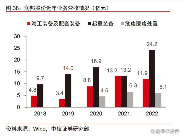 業(yè)務線豐富,布局高端裝備和環(huán)保板塊。公司主營業(yè)務分為包括海風裝備、物料搬運 裝備的高端裝備業(yè)務和包含危廢及醫(yī)廢處理處置服務的環(huán)保業(yè)務。2022 年公司海風裝備、 起重裝備、危廢醫(yī)廢處置業(yè)務分別營收 11.89、24.17、6.07 億元,占比 22.97%、46.71%、 11.73%。公司海上風電裝備業(yè)務主要產品包括各類海上風電基礎樁、導管架、海上風電安 裝作業(yè)平臺、海洋工程起重機等。