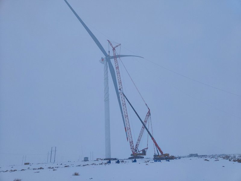 11月27日,在最后一臺(tái)風(fēng)機(jī)的吊裝現(xiàn)場(chǎng),面對(duì)施工環(huán)境的變化和溫度驟降,現(xiàn)場(chǎng)的吊裝工作人員顯得格外謹(jǐn)慎,伴隨著對(duì)講機(jī)中不斷傳來的指令,主吊司機(jī)小心翼翼?yè)軇?dòng)著操縱桿,司索工有的放矢牽引著纜風(fēng)繩,安裝工井然有序,所有人不懼嚴(yán)寒堅(jiān)守在各自崗位上,將巨大的風(fēng)機(jī)葉輪緩緩吊起;到達(dá)指定高度后,原本平行的葉輪逐漸轉(zhuǎn)為垂直并緩慢地向主機(jī)艙靠近;經(jīng)過多次精準(zhǔn)的調(diào)整,風(fēng)機(jī)葉輪終于與主機(jī)實(shí)現(xiàn)完美對(duì)接……吊裝團(tuán)隊(duì)在經(jīng)歷了50多個(gè)小時(shí)的緊張作業(yè)后,風(fēng)機(jī)像一位全副武裝的鋼鐵巨人張開臂膀屹立在天地之間,在隨風(fēng)飄蕩的雪花和不遠(yuǎn)處其他小型風(fēng)機(jī)的襯托下,更顯現(xiàn)出它的挺拔宏偉。