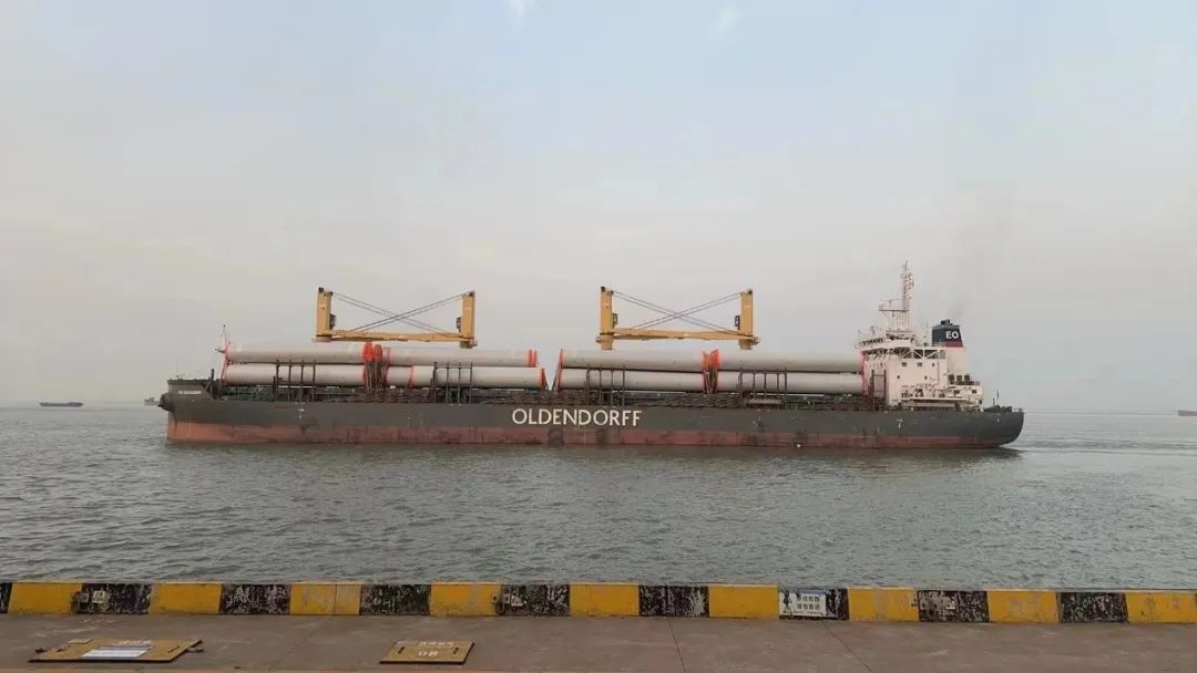 歷經(jīng)5個(gè)日夜的奮戰(zhàn)后,由天順風(fēng)能太倉(cāng)生產(chǎn)基地制造的最后一個(gè)批次15套、75段大型兆瓦級(jí)塔筒,在太倉(cāng)港潤(rùn)禾碼頭順利完成集港、車(chē)船直裝、岸吊吊裝、甲板固定綁扎等一系列發(fā)運(yùn)作業(yè)。
