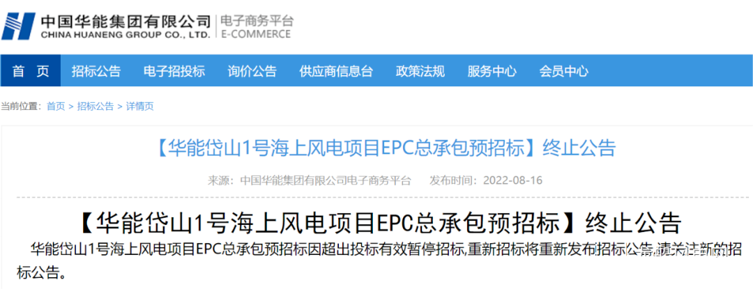 8月16日,華能集團發(fā)布公告稱,因超出投標(biāo)有效期,決定終止華能岱山1號海上風(fēng)電項目EPC總承包預(yù)招標(biāo)項目。
