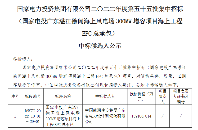 1月15日,國家電投廣東湛江徐聞海上風電場300MW增容項目海上工程EPC總承包中標候選人公示,中國能源建設集團廣東省電力設計研究院有限公司預中標,投標報價13.92億元。