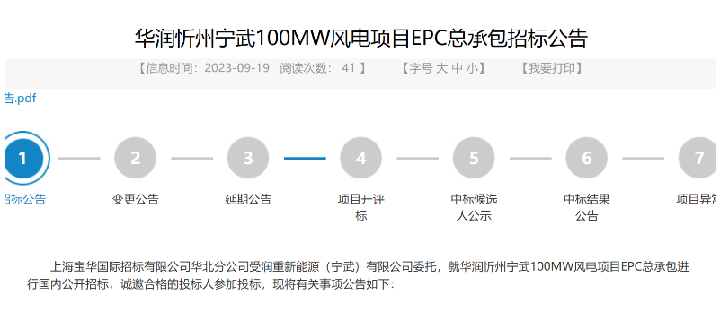 9月19日,華潤忻州寧武100MW風(fēng)電項(xiàng)目、華潤忻州岢嵐100MW風(fēng)電項(xiàng)目EPC總承包招標(biāo)公告發(fā)布。