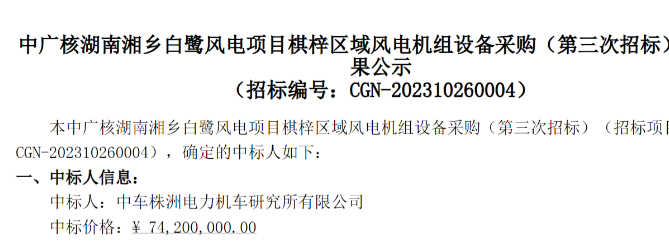 1月2日,中廣核電子商務(wù)平臺發(fā)布《中廣核湖南湘鄉(xiāng)白鷺風(fēng)電項目棋梓區(qū)域風(fēng)電機組設(shè)備采購(第三次招標)中標結(jié)果公示》的公告。