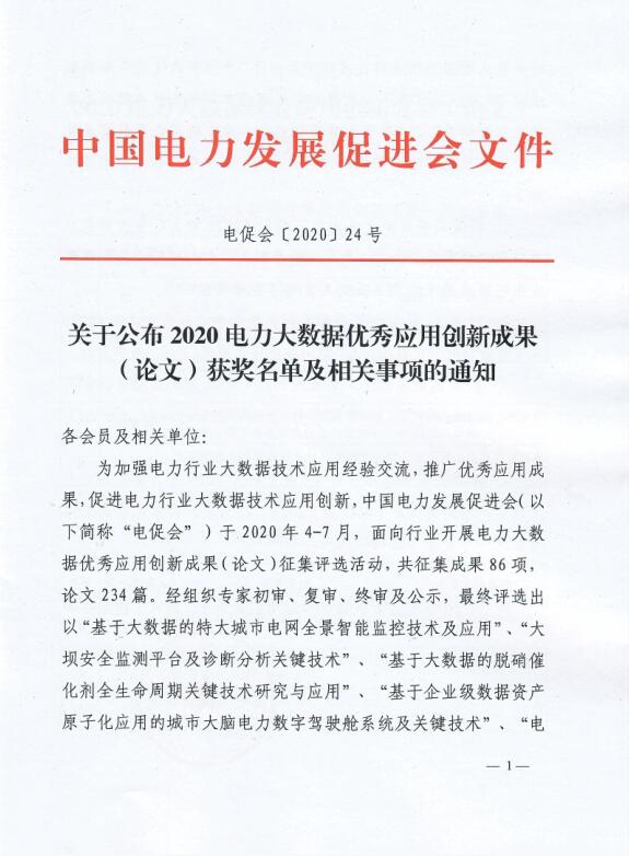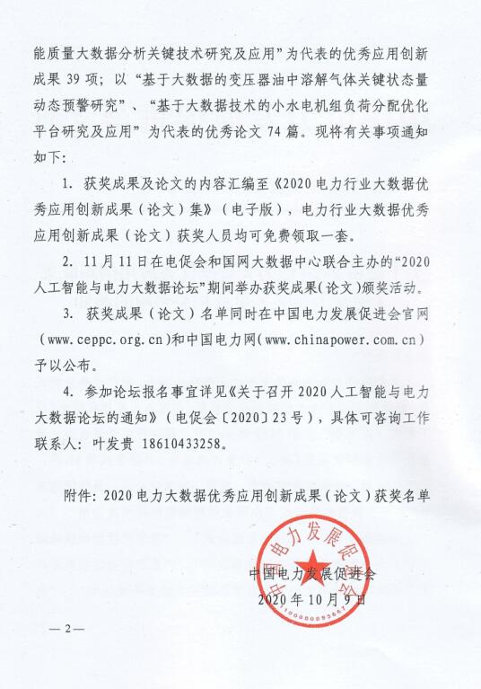 2.11月11日在電促會和國網大數據中心聯(lián)合主辦的“2020人工智能與電力大數據論壇”期間舉辦獲獎成果(論文)頒獎活動。