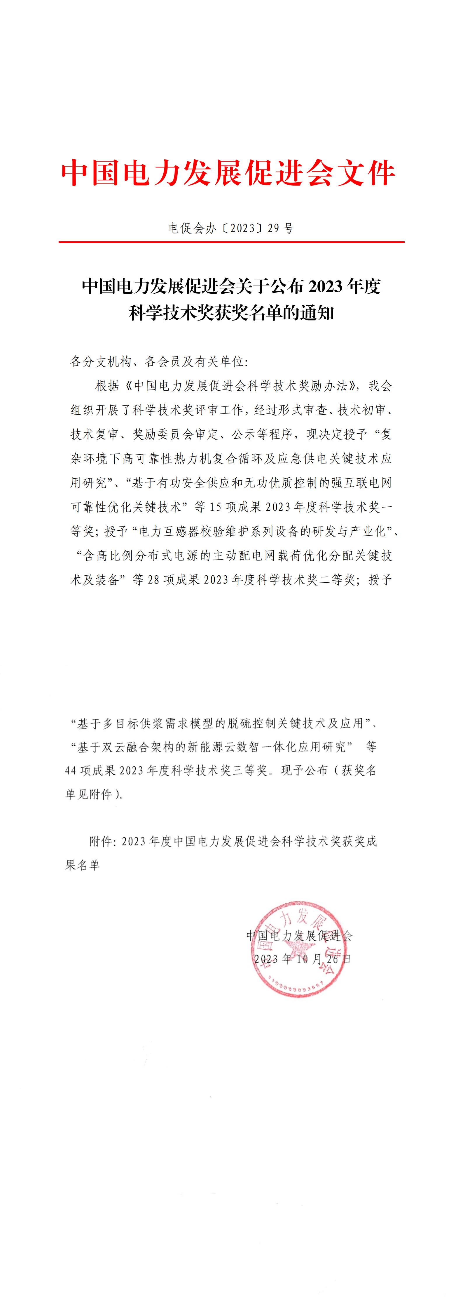 中國電力發(fā)展促進(jìn)會關(guān)于公布2023年度科學(xué)技術(shù)獎獲獎名單的通知