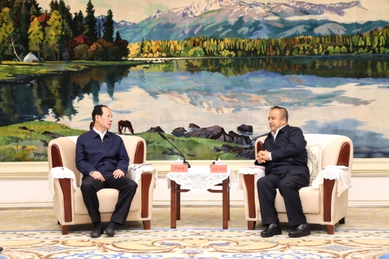 中國(guó)電建黨委書(shū)記、董事長(zhǎng)丁焰章與新疆維吾爾自治區(qū)政府主席艾爾肯·吐尼亞孜會(huì)談