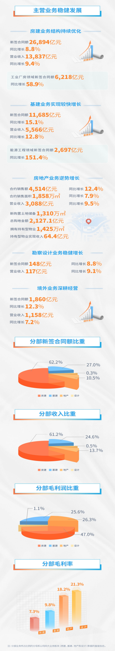 房建業(yè)務(wù)結(jié)構(gòu)持續(xù)優(yōu)化,新簽合同額2.69萬億元、同比增長8.8%;工業(yè)廠房、科教文衛(wèi)體設(shè)施、商業(yè)綜合等公共建筑領(lǐng)域新簽合同額占比持續(xù)提升;基建業(yè)務(wù)發(fā)力重點(diǎn)領(lǐng)域,新簽合同額11,685億元,同比增長15.1%;市政工程、交通運(yùn)輸工程等領(lǐng)域取得一批重大工程;能源工程、水務(wù)及環(huán)保、水利水運(yùn)等領(lǐng)域取得新突破,新簽合同額合計(jì)占比提升至37.3%;地產(chǎn)業(yè)務(wù)加快適應(yīng)新發(fā)展模式,中海地產(chǎn)權(quán)益銷售額位列行業(yè)第二,利潤率保持行業(yè)領(lǐng)先,主要指標(biāo)穩(wěn)中有升。堅(jiān)持聚焦高能級(jí)城市的投資布局,全年新購置土地43宗,新增土地儲(chǔ)備764萬平方米,新增土地貨值位列行業(yè)第一,購地金額人民幣1,342.1億元。全年實(shí)現(xiàn)合約銷售額2,670億元,同比增長4.9%。堅(jiān)持穩(wěn)健審慎的財(cái)務(wù)策略,牢牢把握“三道紅線”調(diào)控下處于綠檔的優(yōu)勢(shì),堅(jiān)持精益建造,在聚焦加快發(fā)展住宅開發(fā)主業(yè)的同時(shí),推動(dòng)商業(yè)物業(yè)、教育養(yǎng)老、物流等業(yè)務(wù)發(fā)展。中建地產(chǎn)積極應(yīng)對(duì)市場變化,豐富土地獲取路徑和方式,新購置土地59宗,新增土地儲(chǔ)備546萬平方米,購地金額785億元;全年實(shí)現(xiàn)合約銷售額1,844億元,同比增長25.3%??辈煸O(shè)計(jì)業(yè)務(wù)穩(wěn)健增長,夯實(shí)傳統(tǒng)設(shè)計(jì)主業(yè),新簽合同額148億元,營業(yè)收入117億元。境外業(yè)務(wù)堅(jiān)持深耕運(yùn)營,全力應(yīng)對(duì)復(fù)雜多變的國際形勢(shì),持續(xù)增強(qiáng)全球資源配置能力。新簽合同額1,860億元,同比增加12.3%,其中建筑業(yè)務(wù)新簽合同額1,755億元,同比增長15.4%。公司大力實(shí)施海外高質(zhì)量發(fā)展戰(zhàn)略,積極參與共建“一帶一路”國際合作。