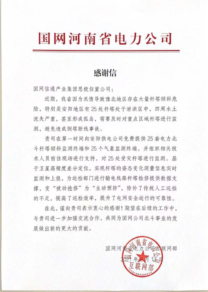 “貴司在第一時間向安陽供電公司免費提供的25套電力北斗桿塔傾斜監(jiān)測終端和25個氣象監(jiān)測終端,為運檢部門進行輸電線路桿塔檢修提供數(shù)據(jù)支撐,提高了巡檢效率,提升了電網(wǎng)安全運行的可靠性……”8月17日,國網(wǎng)信通產(chǎn)業(yè)集團思極位置(吉奧)收到一封來自國網(wǎng)河南電力的感謝信,信中對國網(wǎng)信通產(chǎn)業(yè)集團思極位置(吉奧)在本次搶險救災保電中給予的大力支持表示由衷感謝。