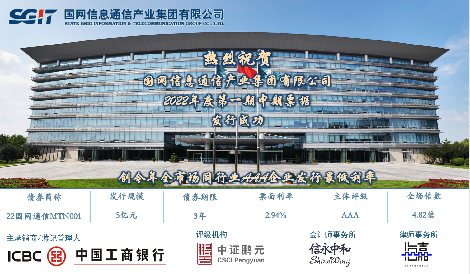 2022年5月20日,國網(wǎng)信息通信產(chǎn)業(yè)集團(tuán)有限公司(以下簡稱“集團(tuán)”)首次公開成功發(fā)行2022年度第一期中期票據(jù)(債券簡稱“22國網(wǎng)信通MTN001”),發(fā)行規(guī)模5億元,期限3年,票面利率2.94%,全場認(rèn)購倍數(shù)4.82倍。該利率較3年期同期貸款利率下降約1.3個百分點(diǎn),為今年全市場同行業(yè)AAA企業(yè)發(fā)行最低利率。