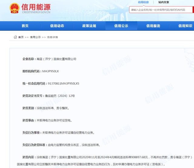 日前,信用能源公布了對瀚藍(lán)(濟(jì)寧)固廢處置有限公司的行政處罰決定,魯監(jiān)能罰〔2024〕12號處罰決定書文號顯示,瀚藍(lán)(濟(jì)寧)固廢處置有限公司未取得電力業(yè)務(wù)許可證發(fā)電。山東能源監(jiān)管辦沒收瀚藍(lán)(濟(jì)寧)固廢處置有限公司2020年11月至2024年4月期間違法所得908897.68元,不再并處罰款,責(zé)令瀚藍(lán)(濟(jì)寧)固廢處置有限公司立即整改未取得電力業(yè)務(wù)許可證擅自經(jīng)營電力業(yè)務(wù)的行為,及時(shí)申請辦理電力業(yè)務(wù)許可證(發(fā)電類)。