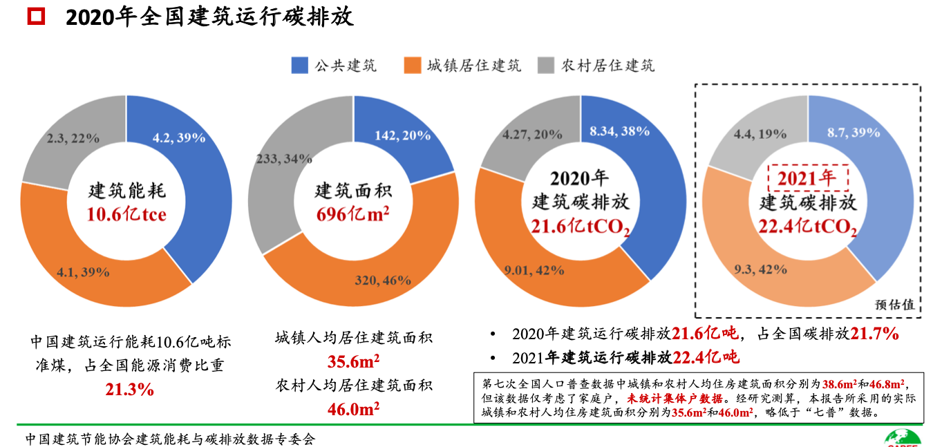 報告披露,2021年全國建筑運行碳排放預(yù)估值為22.4億噸,比2020年略有增加。圖/報告截圖