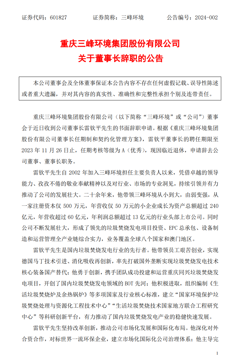1月3日,三峰環(huán)境發(fā)布公告稱,公司董事會(huì)于近日收到董事長(zhǎng)雷欽平先生的書(shū)面辭職申請(qǐng)。根據(jù)《重慶三峰環(huán)境集團(tuán)股份有限公司董事長(zhǎng)任期制和契約化管理方案》,雷欽平董事長(zhǎng)的聘任期限至2023年11月26日止,任期考核等級(jí)為A(優(yōu)秀),現(xiàn)因臨近退休,申請(qǐng)辭去公司董事、董事長(zhǎng)職務(wù)。