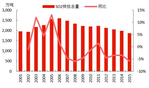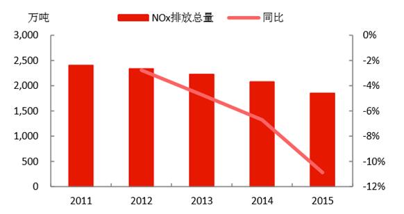 經(jīng)過“十二五”的治理,四項污染物減排約束性指標均實現(xiàn)了持續(xù)下降,完成了“十二五”的減排任務(wù),取得了一定的環(huán)保成果。2015年:1)COD的排放量為2224萬噸,且每年以3%左右的速度下降;2)氨氮的排放量為230萬噸,且每年以3%左右的速度下降;3)SO2的排放量為1859萬噸,每年基本以4%左右的速度下降,而收關(guān)年2015年下降速度高達5.84%;4)NOx的排放量為1852萬噸,“十二五”剛開始治理,當前的下降速度還處于上升趨勢,收關(guān)年2015年下降速度高達10.89%。