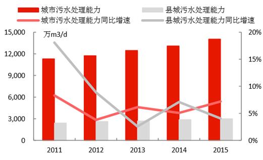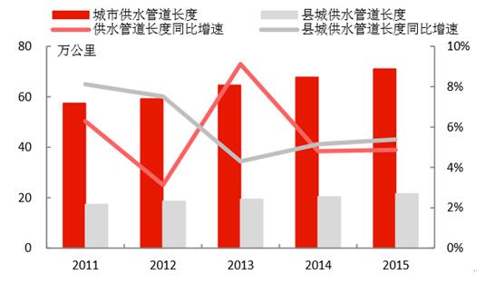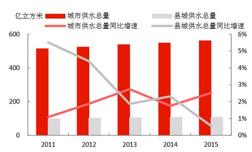 城鎮(zhèn)化的推進,為水務(wù)行業(yè)持續(xù)帶來增量空間。1)我國城鎮(zhèn)人口2015年達到7.71億,近年城鎮(zhèn)人口增速維持在3%左右;城市建成區(qū)面積2015年達到5.21萬平方公里,近年面積增速維持在4-5%。2)城市供水總量在2015年達到561億立方米,同比增速為2.5%;縣城的供水量達106.9億立方米,增速有所下降,僅為0.56%。3)城市供水管網(wǎng)長度在2015年達到71.0萬公里,同比增速為4.87%;縣城的供水管網(wǎng)長度為21.5萬公里,同比增速達5.39%;通過管網(wǎng)建設(shè),是的用水普及率持續(xù)提升,城市和縣城2015年的用水普及率分別為98.1%和90.0%。4)城市污水處理能力在2015年達到1.40億立方米/日,同比增長7.19%;縣城達到2999萬立方米/日,同比增長了4.06%,城市和縣城的污水處理率分別達到91.9%和85.2%,較2010年分別提升了9.6和25.1個百分點。