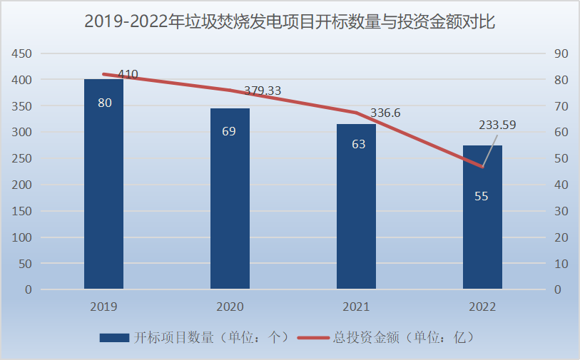 垃圾焚燒發(fā)電行業(yè)在歷經(jīng)“跑馬圈地”、“搶裝潮”等時(shí)期后,進(jìn)入冷靜發(fā)展期。北極星固廢網(wǎng)統(tǒng)計(jì)了2019年-2022年的垃圾焚燒發(fā)電項(xiàng)目開(kāi)標(biāo)數(shù)量以及投資總額,整體呈逐年下滑趨勢(shì)。