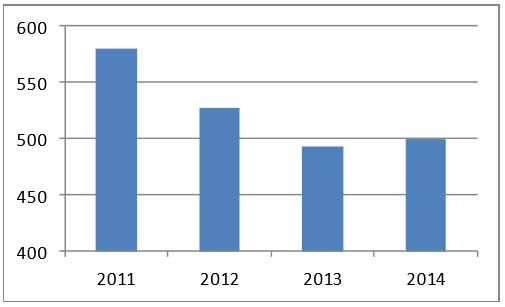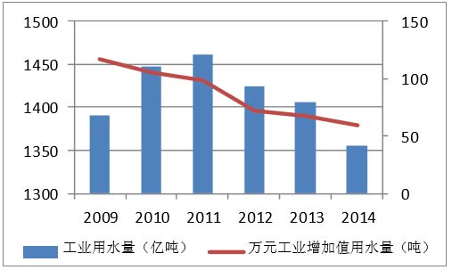 工業(yè)部門是用水大戶。2014年,工業(yè)總用水量1356.1億噸,、占全國(guó)年用水總量的22.2%。萬(wàn)元工業(yè)增加值用水量從2007年的126噸下降至2014年的59.5噸。受用水量減少影響,工業(yè)廢水處理量和處理費(fèi)用較2011年的峰值略有回落。2014年,共處理工業(yè)廢水500億噸。