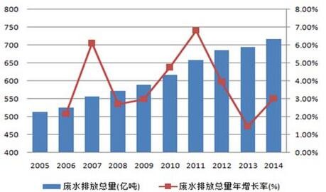 據(jù)統(tǒng)計(jì),目前全國地表水體中Ⅰ類、Ⅱ類、Ⅲ類、Ⅳ類、Ⅴ類和劣Ⅴ類水質(zhì)占比分別為31%、30%、21%、6%、9%和3%,其中Ⅳ類及Ⅳ類以下水質(zhì)水體占比近4成,水質(zhì)污染問題嚴(yán)重。每年水質(zhì)污染給人體健康、工業(yè)生產(chǎn)、農(nóng)業(yè)生產(chǎn)和漁業(yè)養(yǎng)殖等方面造成的經(jīng)濟(jì)損失約2400億。。2014年全國廢水排放總量約為716億噸,較2005年的514億噸增長近4成,2005至2014十年間年復(fù)合增長率為3.4%,保持逐年穩(wěn)步增長。