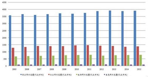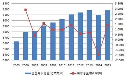 過去10年間,隨著人口增長,城市建設(shè)以及經(jīng)濟(jì)增長,全國用水總量總體呈現(xiàn)持續(xù)增長態(tài)勢(shì),在2015年達(dá)到6180億立方米。(其中,由于首次進(jìn)行最嚴(yán)格水資源管理制度考核、以及農(nóng)業(yè)水價(jià)綜合改革和工業(yè)用水差別水價(jià)政策的推進(jìn),2014年的農(nóng)業(yè)和工業(yè)用水量分別出現(xiàn)下降,全國用水總量同時(shí)環(huán)比下降1.4%。)05至15年的用水總量年均復(fù)合增長率約為0.93%,據(jù)此計(jì)算到2030年全國用水總量將達(dá)到7100億立方米。這一預(yù)測(cè)與《全國水資源綜合規(guī)劃》劃定的2030年用水上限不超過7000億立方米基本一致。因此,在可預(yù)見的未來,用水量仍將繼續(xù)增長。