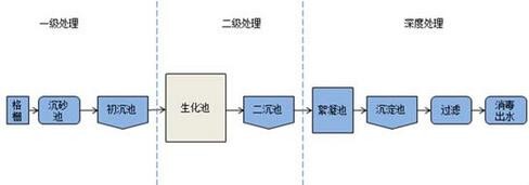 按處理深度通常可將污水處理分為一級(jí)處理、二級(jí)處理和深度處理。一級(jí)處理的主要目的是去除懸浮狀態(tài)固體,常采用物理法,對(duì)于BOD5的去除率一般在20%~30%;二級(jí)處理的目的是進(jìn)一步去除污水中膠體和溶解性污染物,常使用生物法,BOD5的去除率在90%以上;深度處理以達(dá)到更高的處理與排放要求或污水回用為目的。膜法技術(shù)通常用于處理二級(jí)處理活性污泥出水,或者將膜處理系統(tǒng)直接臵于生化池,代替原有二沉池、絮凝沉淀池等環(huán)節(jié)。使用膜法技術(shù)改造之后,傳統(tǒng)污水處理工藝可以直接生產(chǎn)出高品質(zhì)再生水。