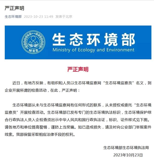 據(jù)生態(tài)環(huán)境部公眾號10月23日消息,近日,有地方反映,有組織和人員以生態(tài)環(huán)境監(jiān)察網“生態(tài)環(huán)境監(jiān)察員”名義,到企業(yè)開展所謂的檢查活動,在此,生態(tài)環(huán)境部嚴正聲明: