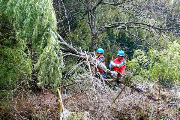 中國電力網(wǎng)訊 “123…加油!123…加油!大家注意安全,控制好繩索方向,千萬不要讓樹壓在線上……”12月15日,在10千伏坪溪Ⅱ線坪嚴(yán)支線湖竹坪次支,國網(wǎng)樂安縣供電公司共產(chǎn)黨員服務(wù)隊隊員正在清理覆冰線路通道外的樹木,保障低溫冰凍天氣電網(wǎng)安全穩(wěn)定運(yùn)行。