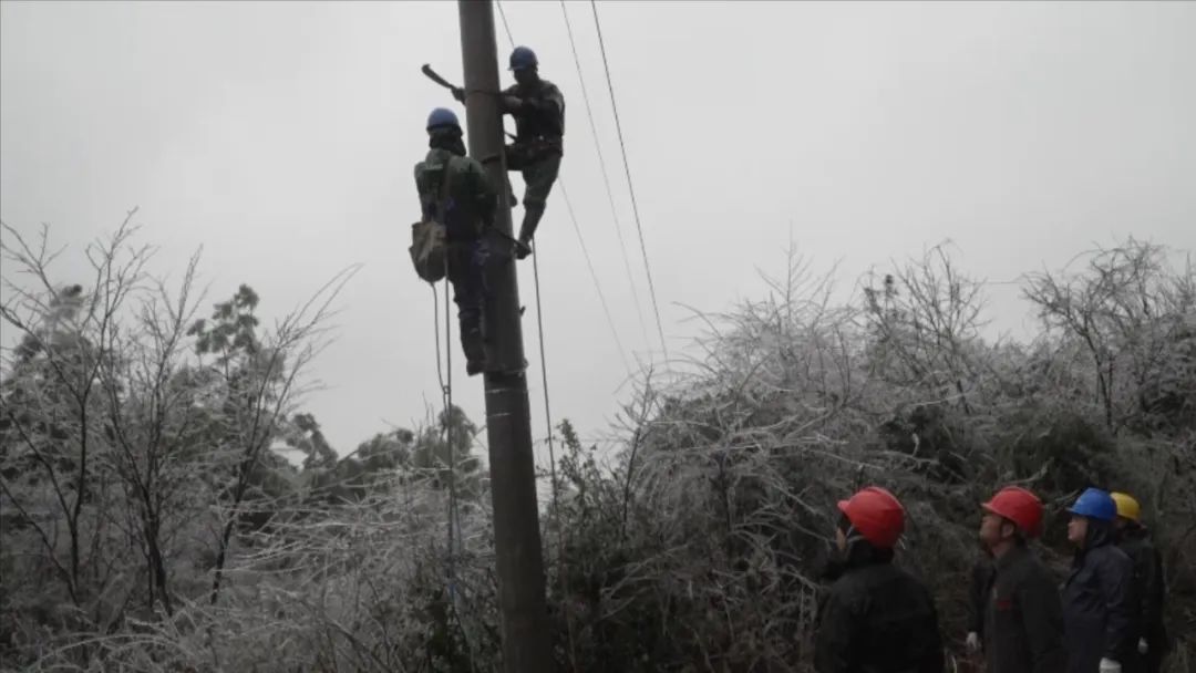 在游城鄉(xiāng)朗埠村,國(guó)網(wǎng)鄱陽縣供電公司的搶修員正在對(duì)10kV朗埠線102號(hào)線桿上,因凝凍導(dǎo)致折彎的電力橫擋進(jìn)行更換,但由于整根電桿裹上了厚厚的冰層,電力搶險(xiǎn)人員只能用工具一點(diǎn)一點(diǎn)敲掉覆冰,然后進(jìn)行爬桿作業(yè)。