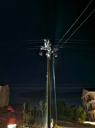 事故發(fā)生后,龔坊供電所所長楊程立即組織人員第一時間趕赴現(xiàn)場,經(jīng)現(xiàn)場查勘后制定搶修方案,在確保人身安全的前提下,連夜開展搶修工作。在搶修現(xiàn)場,做好安全措施后,樂安縣供電公司龔坊供電所10余名員工協(xié)同合作,對損毀的斷桿、導(dǎo)線、橫擔(dān)進行清理,重新立桿、安裝新的拉線、T接導(dǎo)線……搶修工作有條不紊的進行。