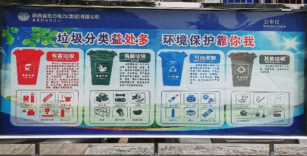 中國電力網(wǎng)訊(通訊員 李娟攝影報(bào)道)為倡導(dǎo)綠色生態(tài)、健康環(huán)保的生活方式,進(jìn)一步倡導(dǎo)垃圾分類理念,近日,淳化供電分公司更新公司文化宣傳欄,對(duì)有害垃圾、易腐垃圾、可回收垃圾、其他垃圾等通過圖文并茂的方式做了詳細(xì)說明,通過宣傳推廣,營造人人關(guān)心垃圾分類、踐行垃圾分類的良好氛圍,讓"綠色、環(huán)保、低碳"的理念深入人心,從不而斷提高大家自覺愛護(hù)環(huán)境衛(wèi)生的意識(shí),讓垃圾分類從口號(hào)變?yōu)榱?xí)慣。