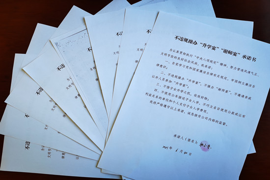 除短信提醒墻外,該公司黨總支重申紀(jì)律要求,組織對(duì)公司全體干部員工對(duì)家中有升學(xué)子女的職工向公司黨總支備案,督促簽訂《不違規(guī)操辦“升學(xué)宴”“謝師宴”承諾書》8份,并開(kāi)展集體約談,予以重點(diǎn)監(jiān)督。