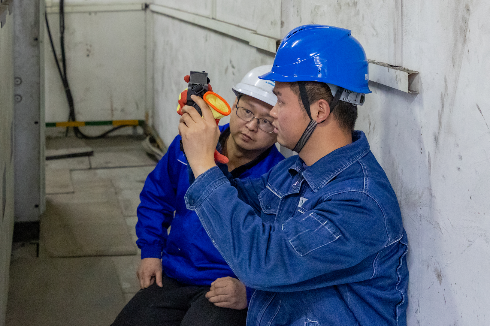 “變壓器高壓側(cè)A相樁頭19攝氏度……溫度正常,運(yùn)行狀態(tài)無異常。”程韋手持測溫儀檢測用戶10千伏變壓器樁頭溫度,查看變壓器油位、油溫,確定檢測值均在設(shè)備運(yùn)行的正常范圍內(nèi)。隨后,利用聲紋相機(jī)逐一檢查每臺(tái)高壓柜的局放值,并透過觀察窗檢查進(jìn)出線電纜情況,確保每相電纜都運(yùn)行正常。