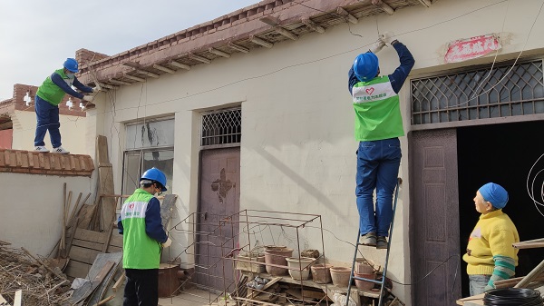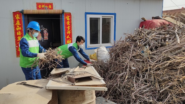志愿者首先對老人家中用電設(shè)備和線路進行了檢查,通過檢查發(fā)現(xiàn)接戶線老化嚴(yán)重,部分絕緣層已經(jīng)破損,存在一定安全隱患。發(fā)現(xiàn)該情況,志愿者立即與烏力吉營業(yè)所溝通,準(zhǔn)備工器具和導(dǎo)線為其重新更換接戶線,消除了安全隱患。隨后,志愿者來到老人家院外,幫助她撿拾樹枝,劈開后送到院內(nèi)充當(dāng)柴禾,并幫老人對小院子進行了打掃。最后志愿者為老人送上米面油等生活用品和真摯的祝福。