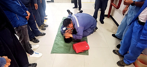 演練模擬大寺鄉(xiāng)發(fā)生6.5級破壞性地震,供電所辦公樓開始搖晃,指揮長嚴世莊大聲呼喊吹哨,各樓層內(nèi)所有人員立即采取正確的避震措施,迅速抱頭尋找最近的墻角、柱角、堅固高大的桌下、柜旁或開間小的衛(wèi)生間、內(nèi)承重墻墻角蹲下、抱頭、閉眼,抓牢或握實以盡量固定身體,使用安全帽等保護頭部,降低身體重心。隨著指揮長第二次呼喊緊急撤離,各樓層緊急組織人員安全迅速從安全指定安全通道疏散到指定聚集點,過程中員工互相呼喚、提醒避震。撤離后清點發(fā)現(xiàn)1人失蹤,急救組立刻對失蹤人員進行搜救,搜救人員在二樓辦公室發(fā)現(xiàn)失蹤人躺在地上,左手臂被傾倒的辦公桌壓住,造成骨折,同時發(fā)現(xiàn)兩根0.22KV電線(鋁塑線)達在傷員身上,并正通有電源,傷員無意識,心跳呼吸停止同時發(fā)生人員觸電,搜救人員立即斷開有關電源,用木棒挑開電線,迅速轉(zhuǎn)移傷員至安全地帶后對其進行心肺復蘇和外傷急救,并撥打120急救電話。經(jīng)全力搶救,傷員已恢復自主心跳和呼吸,搶救人員對其進行外傷包扎后就地觀察,等待120急救人員到來,同時有人員報告一樓安全工器具室發(fā)生火災,指揮組迅速組織人員對著火點進行滅火器滅火。