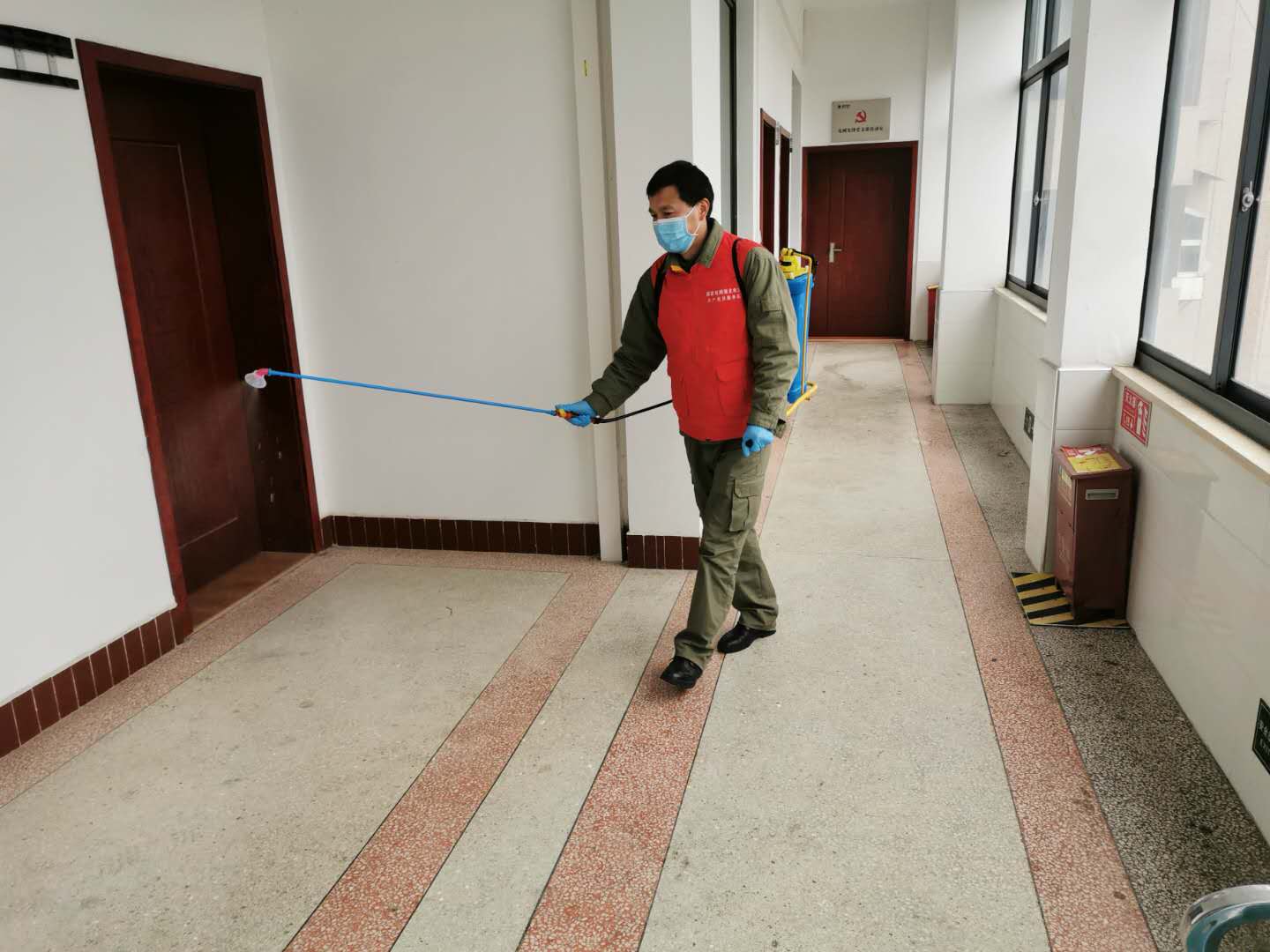 輪班消毒的值班人員搶修去了,他二話不說(shuō),背上消毒藥箱到消毒路段一棟樓地噴灑消毒。