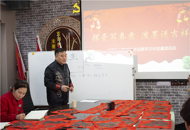 活動中不僅觀看了書法大家揮灑自如、展示書法魅力的書寫,還激發(fā)了職工學(xué)習(xí)書法的熱情。宋主席隨即在現(xiàn)場進(jìn)行了書法授課,宋主席用四句話講述了書法要點:分割均勻、舉一反三、學(xué)會分析、穿插移正。精準(zhǔn)的教授,讓現(xiàn)場的青工們躍躍欲試,紛紛拿起手中的毛筆開始練了起來。青工程斌斌說:“宋主席的授課讓我找出了自己在書法中可以進(jìn)步的地方,平常忙于工作,每次想學(xué)習(xí)一下書法都沒有時間,這次這個機(jī)會太好了!”新入職員工也表示宋主席的書法飄若浮云,矯若驚龍,字里行間流露出對分局員工真切的祝福,讓我們心里暖暖的。聲聲問候,情暖人心,送春聯(lián)的同時也將溫暖送到了分局員工的心里,為即將到來的春節(jié)增添了濃濃的喜慶氛圍,分局職工接過寫滿祝福和美好祝愿的春聯(lián),喜悅之情溢于言表。