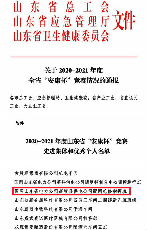 近日,從山東省總工會獲悉,高唐公司配網(wǎng)搶修指揮班獲評2020-2021年度全省“安康杯”競賽優(yōu)勝班組,全省共評選出60個班組,其中供電系統(tǒng)共有5個班組獲此殊榮。