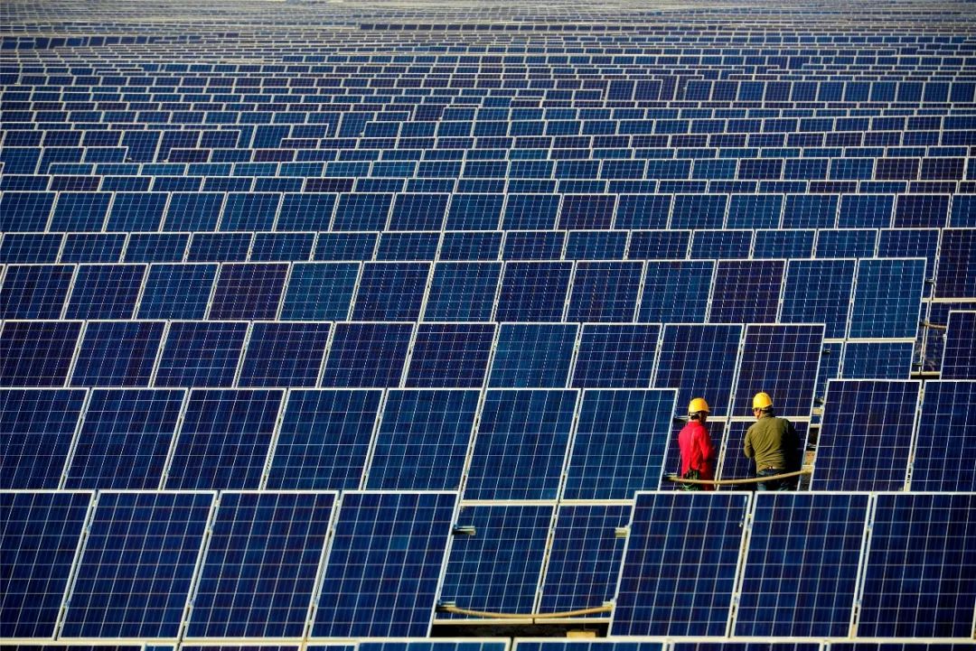 國家電網(wǎng)甘肅電力連心橋共產(chǎn)黨員服務(wù)隊隊員在光伏電站開展檢查服務(wù)。