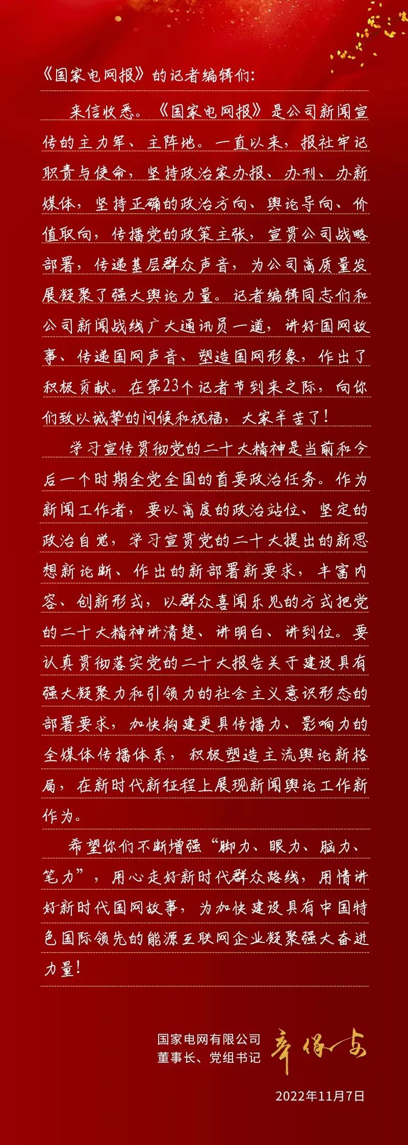 在第23個中國記者節(jié)到來之際,11月7日,國家電網(wǎng)有限公司董事長、黨組書記辛保安給《國家電網(wǎng)報》的記者編輯回信,要求認真學習宣傳貫徹黨的二十大精神,不斷增強腳力、眼力、腦力、筆力,用心走好新時代群眾路線,用情講好新時代國網(wǎng)故事,為加快建設具有中國特色國際領(lǐng)先的能源互聯(lián)網(wǎng)企業(yè)凝聚強大奮進力量。