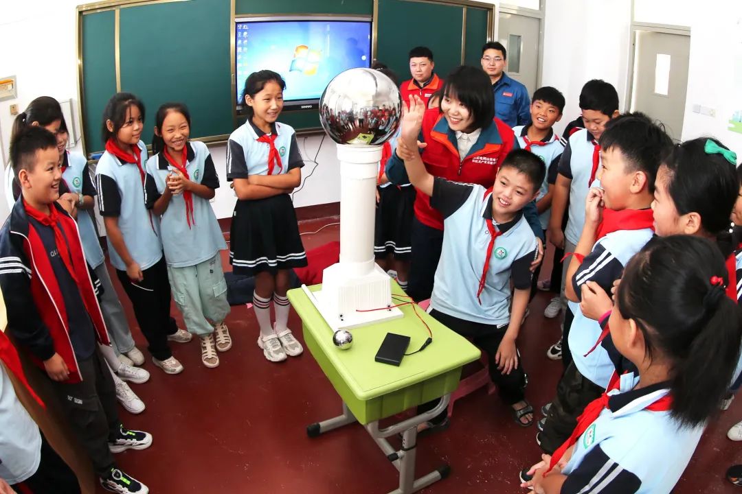 國網山東棗莊供電公司志愿者在薛城夏莊小學電力愛心教室,與學生一起做用電小實驗