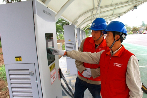 中國(guó)電力網(wǎng)訊 5月13日,江蘇連云港市東??h供電公司駝峰供電所服務(wù)人員趙孫華、何文軍在縣開(kāi)發(fā)區(qū)花卉市場(chǎng)門(mén)前檢查電動(dòng)汽車(chē)充電樁運(yùn)行情況。