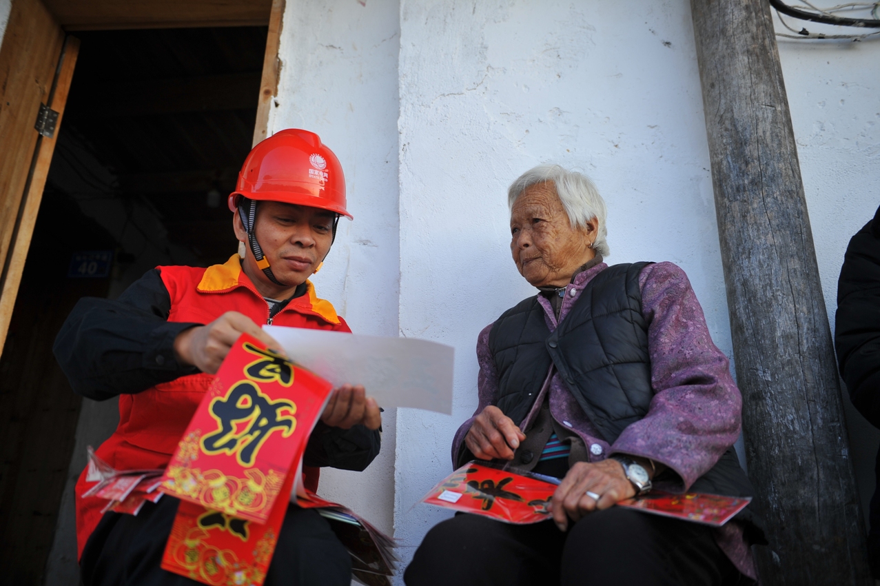 夕陽西下,當國網(wǎng)仙游縣供電公司供電員工收拾好工具,準備離開去其他村民家時,發(fā)現(xiàn)老人家門口的春聯(lián)還沒貼。于是,他們就自費給老人買來了春聯(lián),并為老人解說春聯(lián)上的寓意,老人高興地臉上皺紋都笑開了花……(徐海豐)